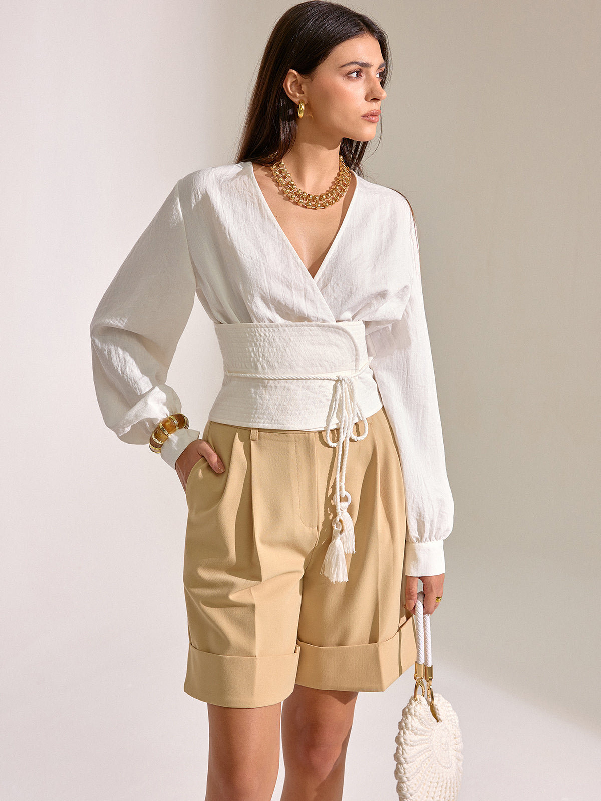 Orta Bel Pileli Manşetli Şort