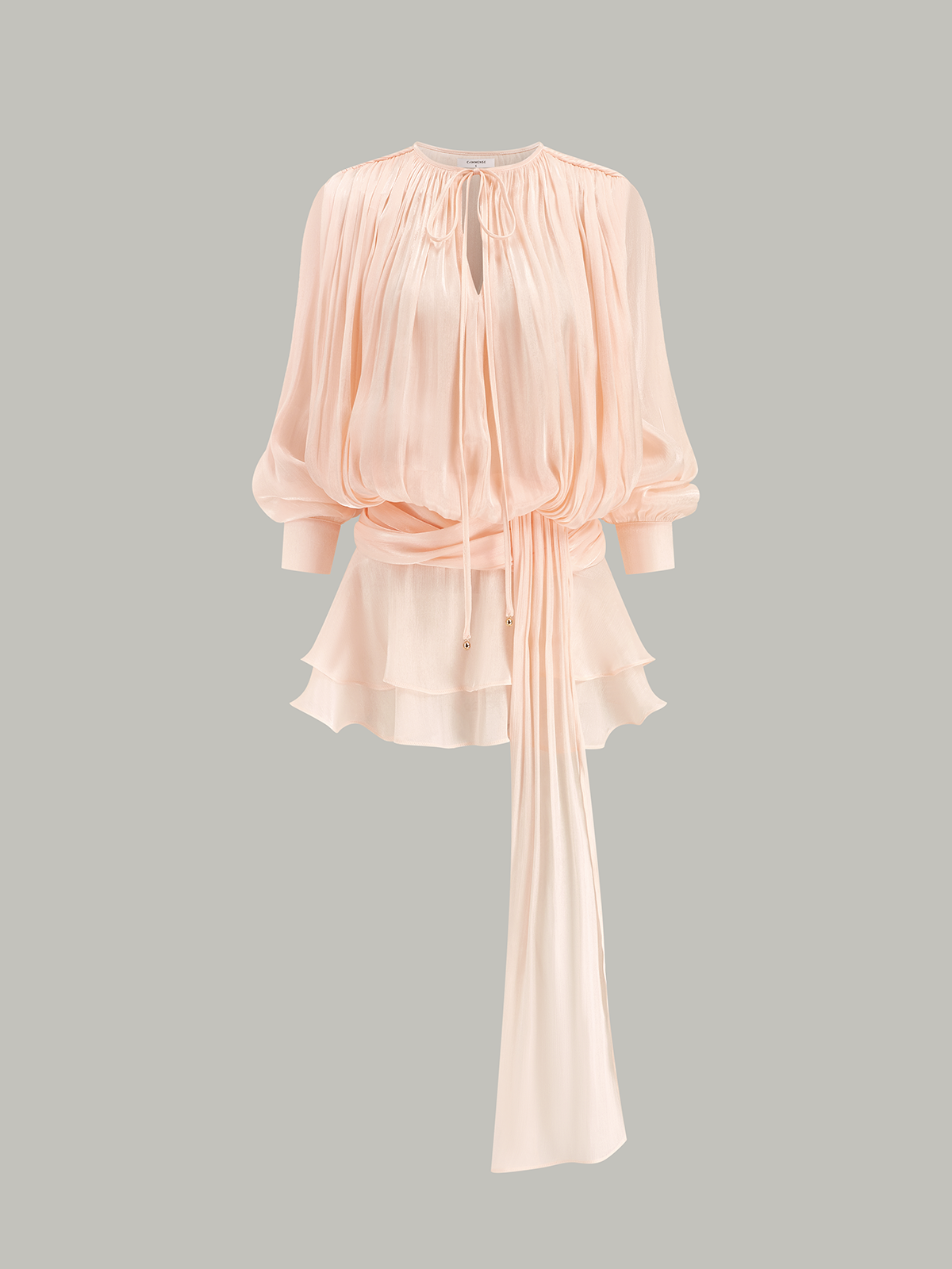Yarı Şeffaf Katlı Drapeli Bağcıklı Bel Mini Elbise